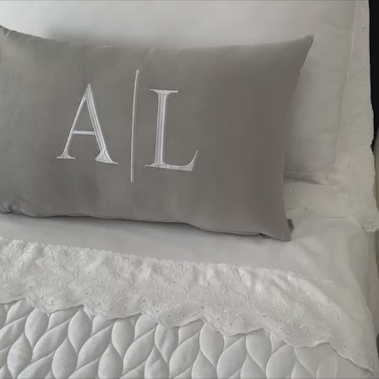 O Par de Almofadas com Iniciais Married une o veludo cinza claro à elegância do bordado branco, criando um conjunto delicado e sofisticado que transmite aconchego e exclusividade.