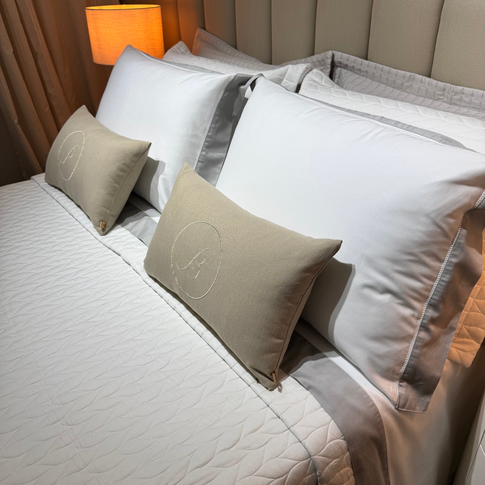 As almofadas personalizadas desmonstram o cuidado presente nos detalhes da casa. Dão um toque de identidade na medida, finalizando a arrumação da cama com sofisticação.